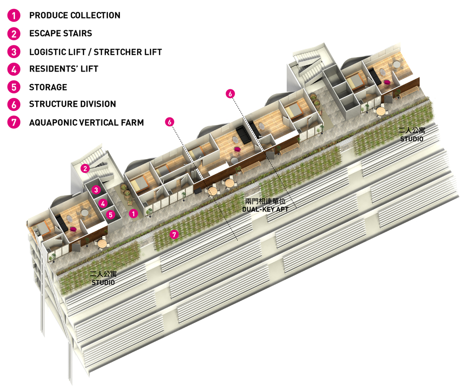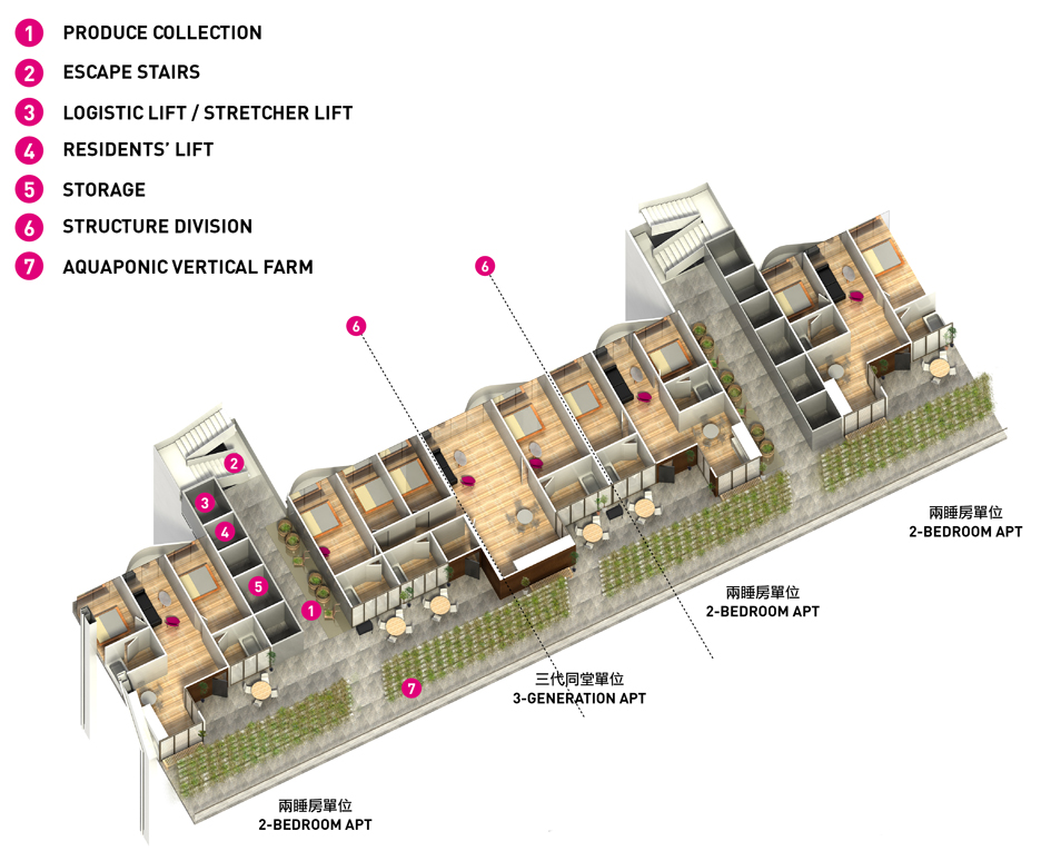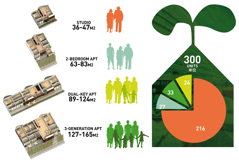 這些家庭單元將被設置在錯列曲線樓群的不同位置,并圍繞著農場區域以提供給居民觀察植物生長的機會。