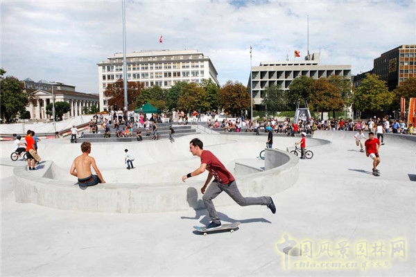 在廣場中央的正北方,軸線與菱形的兩個相鄰邊所構成的三角區域上建有滑板公園、兒童游樂場以及一片綠化非常精致的區域。
