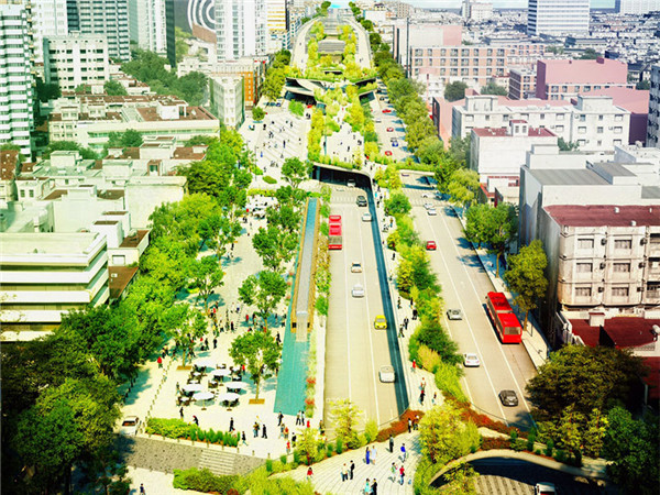 公園的主步道將沿著大道的中央延伸;并且針對自行車、溜冰、輪椅和散步者都打造了專屬的小道。策略性的人行橫道使行人能夠從側邊的人行道進入中央空間,同時這里的上層區域設有零售店和點綴有精致綠化的散步步道。