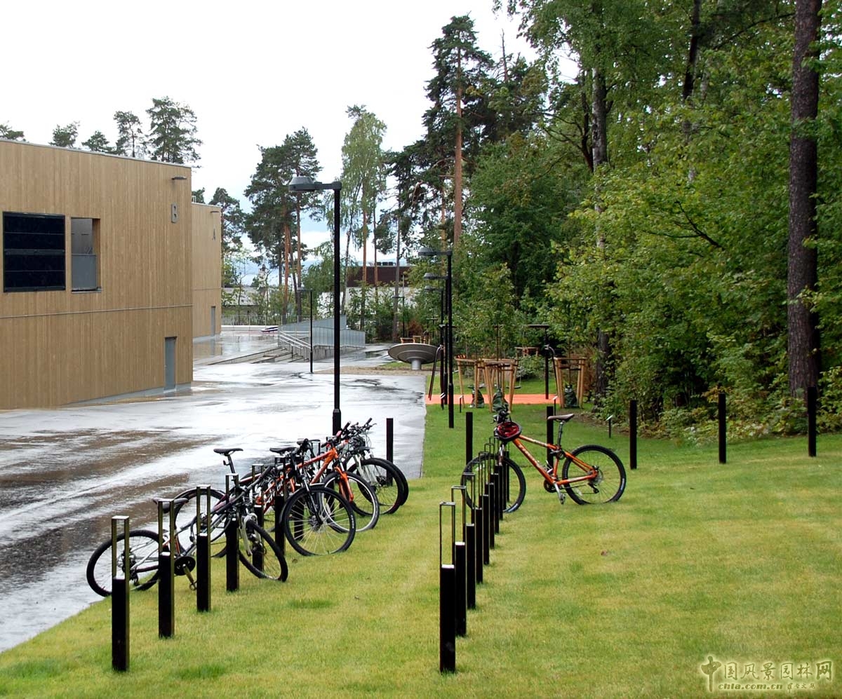 由于BjØrnsletta學(xué)校是奧斯陸地區(qū)第一個(gè)“被動(dòng)式建筑”,因此整個(gè)項(xiàng)目從選材到運(yùn)作,都突出環(huán)境友好型的景觀設(shè)計(jì),強(qiáng)調(diào)低碳節(jié)能可持續(xù)發(fā)展。校園內(nèi),機(jī)動(dòng)車停放的空間縮至最小,而自行車的停放空間卻設(shè)置的極為充足,以此來提倡低碳出行。
