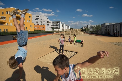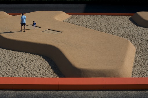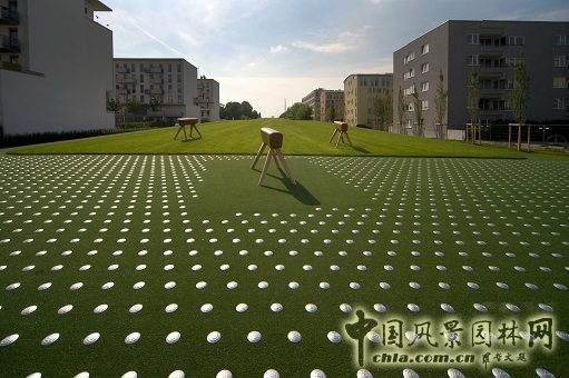 鐵路蓋頂公園的新穎之處在于其可觸摸性上。這個古老而浪漫的夢想借助現代化仿制景觀得以呈現。整個景觀被嚴格地劃分為沙地景觀、沙丘和草坡。沙地景觀是一個大型的兒童沙坑,沙丘則是一系列網狀游戲裝置和人造假山。沙丘上裝有蹦床,孩子們在上面跳躍。整個景觀呈現出一種連續性、互動性的雕塑外觀。起伏的綠坡其平面呈長方形,充滿建筑感,表面鋪有人造草皮。一片人工草坪上,"放牧"著一群體操鞍馬。