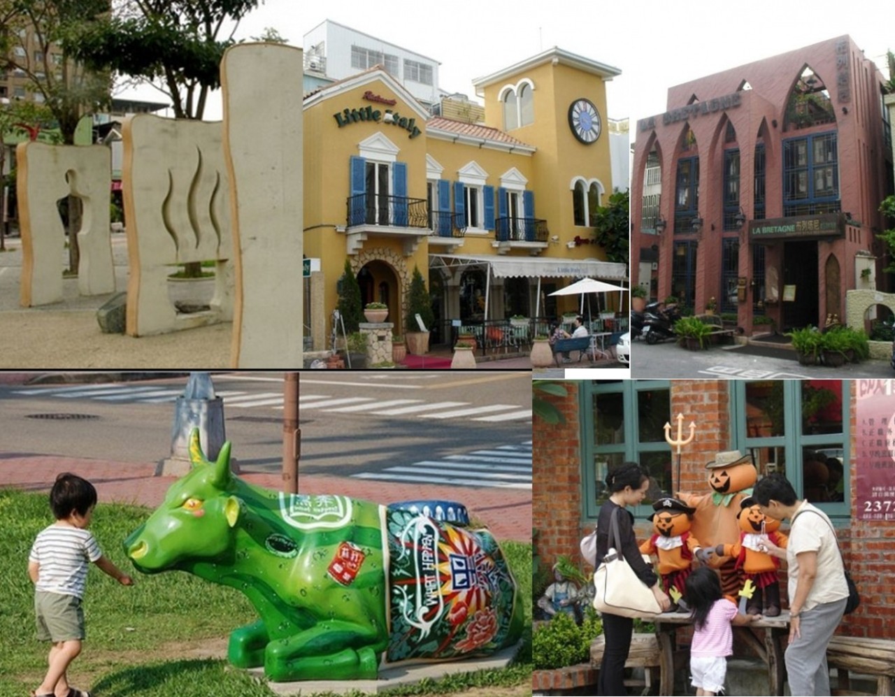 雖然整體空間形式變化比較單一,但是沿途隨處可見各種藝術造景的特色雕塑,異域風情的建筑。兩側的房屋從一開始的矮舊平房到現在各種不同的地中海、法式、意式、甚至是仿古建筑的異國主題餐廳、咖啡館。
