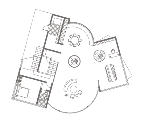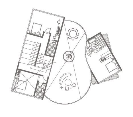 這雖然是一座用于休閑的家庭別墅,總共有3層,最高層在蠶繭的中央,分別是圓形的廚房和客廳。右面分布著臥室。3層與家庭房鏈接的是圖書室,溫暖的午后,坐在屋頂的花園,一杯咖啡,一本書,足以度過一個悠閑的下午。