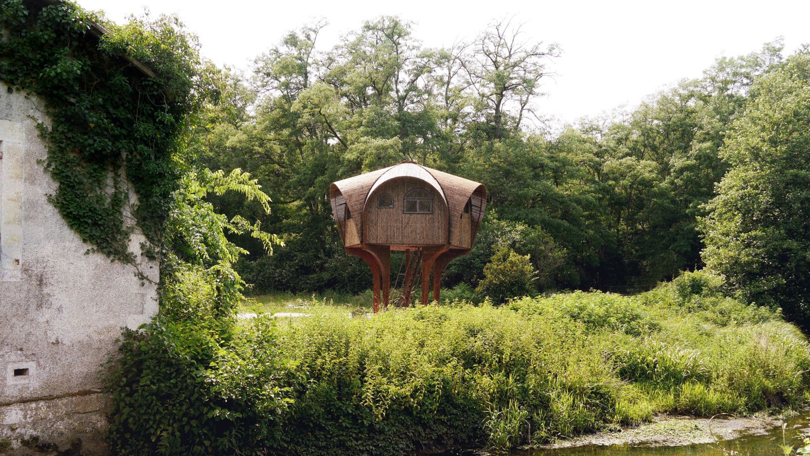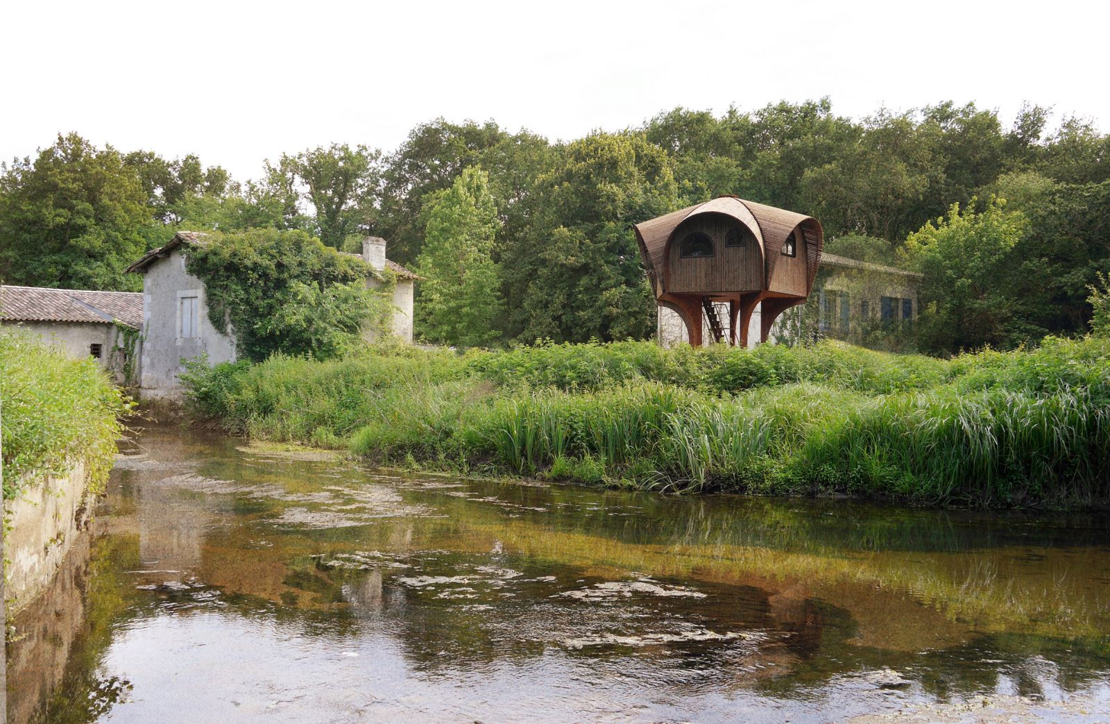 小屋坐落于波爾多地區(qū)重要水源地邊的林地中,地形特殊,設(shè)計團(tuán)隊對小屋設(shè)計進(jìn)行了加高處理,更好地使其適應(yīng)周邊環(huán)境。