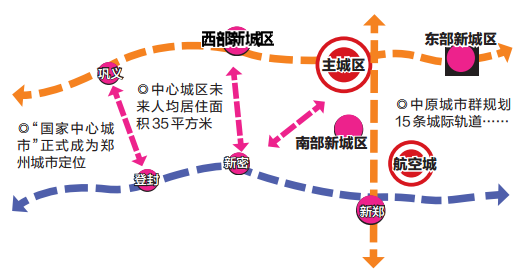 一主:鄭州主城區(qū)。一城:航空城(鄭州航空港經(jīng)濟(jì)綜合實(shí)驗(yàn)區(qū))。三區(qū):東部新城區(qū)、西部新城區(qū)和南部新城區(qū)。四組團(tuán):登封、鞏義、新鄭、新密四個(gè)外圍組團(tuán)。