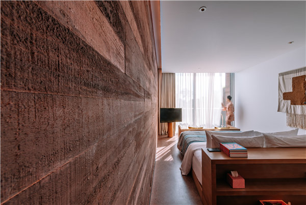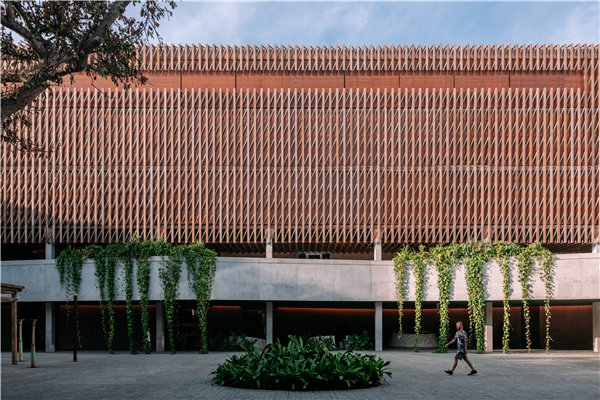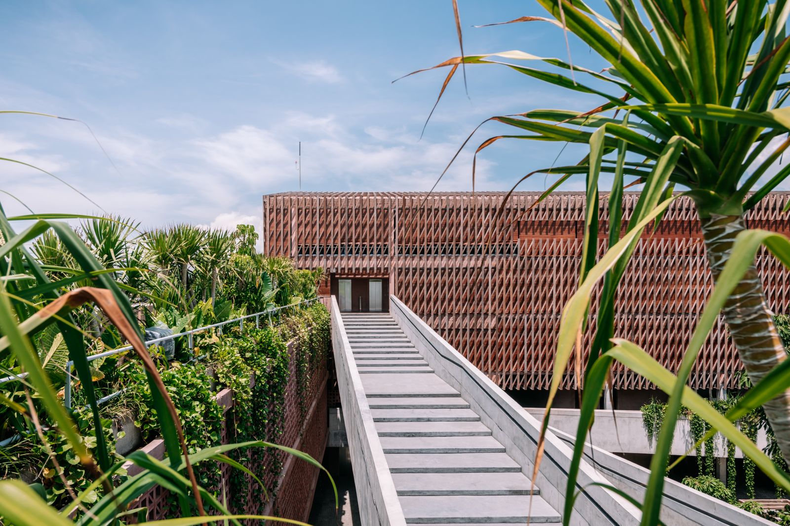 項(xiàng)目設(shè)計(jì)以印度尼西亞的文化脈絡(luò)為依歸,地面的開(kāi)放平臺(tái)有如巴厘島普遍建于地面的庭園,而酒店二樓的私人花園則喚起印度尼西亞傳統(tǒng)建筑的抬升庭園設(shè)計(jì)。酒店部分混凝土墻壁的質(zhì)感,由本地工匠巧制,走廊的立面設(shè)計(jì)受巴厘島傳統(tǒng)占卦歷蒂卡啟發(fā)。