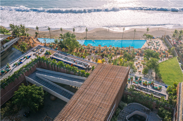Potato Head Studios的建筑是一個(gè)由基座柱子抬升起來(lái)的環(huán)形結(jié)構(gòu),里面是私人酒店房間及其他設(shè)施,包括展覽空間及可以觀賞日落的酒吧。抬升的結(jié)構(gòu)騰出地面間作為“開(kāi)放平臺(tái)”,直接通往海灘,而此空間充滿可能性,是節(jié)慶﹑文化活動(dòng)及日常活動(dòng)的場(chǎng)所,讓大眾共同體驗(yàn)巴厘島的當(dāng)代文化。酒店屋頂是向公眾開(kāi)放的雕塑公園,一條公眾走廊連接酒店餐廳﹑泳池及水療設(shè)施,并通往雕塑公園。