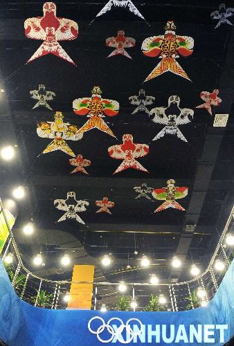 這是2008年7月10日拍攝的在北京奧運會主新聞中心中懸掛的風箏。在北京奧運會主新聞中心內,隨處可見的“中國元素”營造出濃郁的中華民族傳統文化氛圍。 新華社記者徐家軍攝