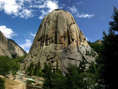 神鐘山:又稱阿米爾薩拉峰。一座神奇絕妙狀如倒扣石鐘的花崗巖奇峰在額河南岸平地而起,相對高度351米,孤峰傲立,為阿爾泰山之最。神鐘山猶如巨神插足碧水綠蔭之間,頭枕藍天白云,顯得巍峨神奇,變幻莫測。巖壁縫上生長著白樺樹、青松和西伯利亞云杉,雨過天晴,彩虹劃天而過,景色十分壯觀。登上山頂,極目遠望,群峰巍峨,額河峽谷躍入眼簾,山腳下的額河水像翡翠一樣在巨石間穿梭,繞過鐘山腳,絕塵而去。每到秋季,神鐘山峽谷兩側的紅葉染紅了整個峽谷,秋意盎然,一派北國風光,猶如畫中游。 季蘭德溫泉:季蘭德是蒙古語的音譯詞.溫泉從花崗巖裂隙中自然流出,屬天然保健溫泉。水溫適宜,水質清澈柔滑,此溫泉浴強身健體,防病治病,哈薩克牧民都有節日來洗溫泉的習俗。在季蘭德溫泉附近分布著三個神奇的泉眼。胃泉,飲泉水數日可治好胃病;降壓泉,血壓高的人飲此泉水后會降壓;不飽泉,飲此泉水,無論喝多少也不會有飽的感覺。