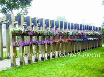 圖為朝陽區(qū)秀木廣場用防腐木搭建的花架,其上垂吊著各色牽牛,感覺很大氣。