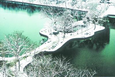 從包河景區(qū)向西便是銀河景區(qū)。站在橫跨銀河景區(qū)的桐城路大橋上,可一覽“銀河”秀色全貌。桐城路橋的前身便是合肥著名的赤闌橋。南宋著名詞人姜夔年青時曾幾次客居合肥城南赤闌橋西,并著有20多首與合肥有關(guān)的詞作。而今,橋西南角一處有姜夔塑像的“白石知音”景點即將建成,表明了合肥人對姜夔永遠(yuǎn)的懷念。銀河景區(qū)以水為中心,四周散落著花草假山,茂林修竹,輔以江南風(fēng)格的園林建筑。整個景區(qū)景色秀麗,視野開闊,人工造景與自然景色巧妙搭配,“雖系人作,宛若天開”。而西首河坡上的“迎曦亭”則是這一景區(qū)的精髓。它是個三層跌落式徽派建筑,隨地形的起落而建。清晨登亭,當(dāng)晨曦初露的時候,看太陽慢慢探出頭來,天上人間,銀光燦燦,水天一色,確有“銀河萬盞星光,迎曦人立寶光中”的超凡脫俗、出神入化的境界。
