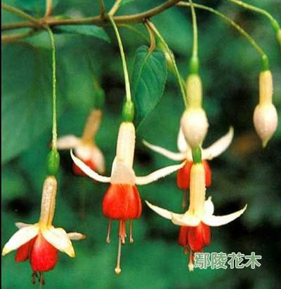 吊鐘海棠又名倒掛金鐘、燈籠海棠、吊鐘花,廣東又稱寶蓮燈。是柳菜科,倒掛金鐘屬的常綠灌。高可達1米。莖光滑,枝細而稍下垂,常帶紫紅色。葉對生或三葉輪生,具短柄,卵狀披針形。花單生葉腋,花梗長約5厘米,下垂;萼筒長圓形,萼片4裂,放射狀位于花冠下方,花冠倒掛,呈鐘鈴狀,并由此而得名。雄蕊,雌蕊高出花冠,如象燈籠的吊須。