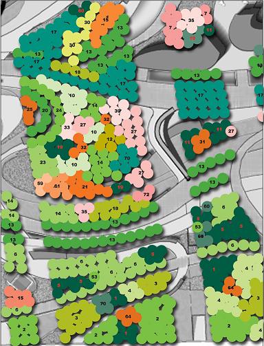 第二個原則,所謂的"適地適樹"。剛才提到了土的問題,我們這個土實際上一方面是再造的人工土,一方面是外來的土,一方面是本地掏出來的土。現在看到的世博公園里地形突出也好,還是樹相變換也好,實際上里面大量埋的都是固體垃圾,表層的土壤我們有意識布局不同的土壤進行調節。比如說種喬木的地方我們把土壤堆得厚厚的,種一般地被的地方土層沒有這么厚,這就牽扯到物種的選擇了。所謂適地適樹,適合的地種適合的樹,反過來種適合的樹造適合的地。在世博園局部區域也可以叫"適樹適地",因為地本身也有再造的成份,所以也有"適樹適地"的說法。