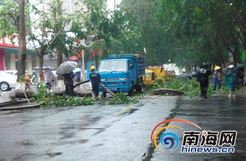 熱帶風暴“芭瑪”給海口帶來了狂風暴雨,12日中午12時許,海口解放西路一棵大樹被狂風連根拔起,樹干正好橫跨在馬路中央,使得整個解放西路交通完全堵塞,很多經過該路段車輛只好繞道而行。 當天中午12點20分左右,南海網記者冒雨趕到現場看到,在解放西路和大同路的交叉口有兩處已經拉起了交通警戒線,只有大同路能單向通行。