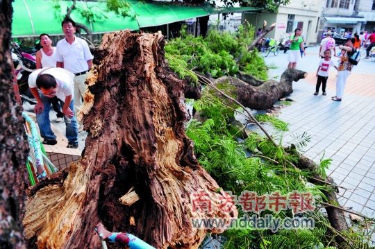 一聲巨響過后,懷抱粗的古樹樹干倒地。昨日下午4時30分許,市區南壇的惠州市機關幼兒園里一棵古樹折斷,砸中幼兒園里的單車棚棚頂,所幸未有人受傷。園林部門趕到現場處理,發現該棵古樹樹干幾被白蟻蛀空。據悉,該棵古樹有上百年樹齡,擁有林業部門制作的古樹名木“身份證”。 工作人員:幾天前就發現有白蟻痕跡 “當時只聽到轟隆隆聲響,抬頭望去就發現院子里這棵樹倒下來了,砸在車棚頂上”,昨日下午,惠州市機關幼兒園的老師站在一棵橫在幼兒園院子里的鳳凰樹樹干前,等待園林部門前來處理這棵倒折的古樹。這棵鳳凰樹粗達兩人懷抱,往上分出兩根枝椏,倒折在地的是其中一根稍粗的枝椏。從樹干斷折處可以看到,里面有密密麻麻的白蟻在爬動著。“幾天前,我就發現這棵樹樹干上有白蟻爬行的痕跡,但是沒想到,整根樹干都給白蟻蛀空了”,幼兒園一名工作人員告訴記者。 記者看到,幼兒園院子里還有3棵粗壯的鳳凰樹。前年已經有一棵鳳凰樹因為被白蟻蛀蝕,向園林部門提出申請后被鋸斷,想不到現在又有一棵樹遭到白蟻蛀蝕。 未來:或申請鋸樹避免隱患 “幸虧當時正是上課時間,孩子們都在課室里,沒有出來活動”,幼兒園一名工作人員慶幸著。工作人員紛紛議論,“這棵古樹也算是有靈氣了。如果早幾天砸下來,說不定會砸傷小朋友”,幾天前,幼兒園舉行一場持續幾天的公益活動,每天下午老師們都帶著小朋友聚集在這棵大樹下,幸虧那時大樹沒有砸下來。 相關工作人員告訴記者,鳳凰樹樹質松脆,達到一定樹齡后,遭遇臺風暴雨時很容易折斷,不適合栽種在學校及幼兒園里面。據悉,惠州市機關幼兒園有著50年的建園史。幼兒園的工作人員告訴記者,早在建園之前,這些鳳凰樹就已經存在。幼兒園老師們稱,每年樹木生長旺盛季節,園里工作人員都會拿著自制的高竿鋸樹工具,將枯折的樹干或者是枝葉過于茂盛的樹干鋸斷,防止樹干砸下來傷到小朋友。“但是我們沒權利將這些古樹砍斷”。據悉,幼兒園里的這幾棵鳳凰古樹,都擁有林業部門頒發的古樹名木“身份證”,不能隨便砍斷破壞。 幼兒園相關負責人表示,這幾棵大樹接連被白蟻蛀蝕,他們將立即聯系園林部門,對現存的另外幾顆古樹做一番全面檢查。如果有可能,將向相關部門申請將古樹鋸斷或者是移走。