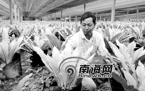 南圣鎮大信花卉基地里種滿了鳥巢蕨,每盆蕨可賣八十元到一百元。本報記者蘇建強攝 記者今天獲悉,五指山市南圣鎮種植的鳥巢蕨如今已成花卉市場上的新寵,一片葉子就可賣到1.2元,有關人士認為,五指山又發掘一條農業致富的新路子。 五指山市南圣鎮大信花卉基地的技術指導曾祥鋼介紹,鳥巢蕨是本地特有品種,滿山都是,以前沒人認為它還能生財。鳥巢蕨孢子掉在地上就能發芽,嫁接到樹上也能生長,管理不復雜,而且品質優異。 據他介紹,五指山的鳥巢蕨葉片大而光鮮,粉綠可人,色澤耐久,可保持20天以上。這些特性得益于南圣鎮得天獨厚的地理與氣候條件:氣溫一般在攝氏32度以下,晝夜溫差大,光照充足,水質純凈,海拔在520米以上。據介紹,連三亞種植的鳥巢蕨也拿到五指山市催花。 據南圣鎮負責農業的副鎮長黃忠敏介紹,全市有兩個種植園種植鳥巢蕨共有100畝,全在南圣鎮。大信基地種植的鳥巢蕨有40畝,每畝能種1000盆,當地農民以土地入股,地租收入有1100元/畝。業內人士分析目前我省種植的鳥巢蕨只能滿足5%市場需求,尚有95%的缺口。 據了解,鳥巢蕨又名巢蕨、王冠蕨、山蘇花,商品名“聚寶盆”,可做單叢呈吊籃狀垂掛,給居室播清揚涼,或在截短的棕櫚樁干、蛇木樁干的不同部位附生配置大小不同的植株,其葉帶狀如古代飛天神女的羅衫翠影輕飄,其叢狀附生植株又如同鳥巢懸掛樹端。
