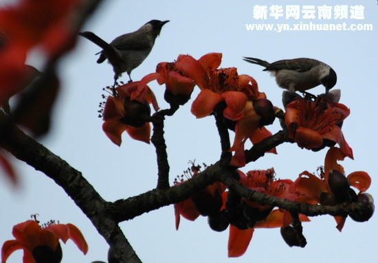 近日來,云南勐臘縣境內的木棉樹紛紛綻放花朵,吸引了鳥兒前來享受“花蜜大餐”。新華社發(李云生 攝)