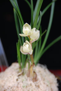 據工作人員介紹,這株“素冠荷鼎”由四株蓮瓣蘭苗木組成,市面上極其少見,屬蘭花種別中的稀世珍寶,也是云南省大理蕩山洲蘭園的鎮園之寶,已經連續五年蟬聯蘭博會特等金獎。據悉,去年曾有買家出價1000萬元人民幣,主人都沒舍得賣,目前,該株蘭花已估價1500萬元人民幣,如果有買家出得起價,也并非非賣品。 為保護好這個寶貝,這株天價蘭花不僅有透明玻璃框保護,更有五名保安圍在周圍當起保鏢。 2010年3月20日上午,云南產“素冠荷鼎”在亞太蘭花大會展臺前集聚了不少圍觀市民,不停議論著它的身價。據工作人員介紹,“素冠荷鼎”已經連續五年折戟蘭博會特等金獎,名聲煊赫,2009年就有買家出價一千萬,“主人都沒舍得賣!”由四株連瓣蘭苗木組成的“素冠荷鼎”,市面上極其少見,屬蘭花種別中的“稀世珍寶”。蓮瓣蘭“素冠荷鼎”是云南大理蕩山州蘭園的鎮園之寶。 據了解,蓮瓣蘭“素冠荷鼎”姿態優美,數量極其稀少,集合了蓮瓣、素心及葉型草三大精品蘭特點于一身。在市場上,一株“素冠荷鼎”的售價高達400萬。 據悉,與蓮瓣蘭“素冠荷鼎”同時獲得此次蘭花“兩會”特別金獎的另外一株蘭花名為“龍袍”,是由日本名古屋國際蘭花大會組委會永田治彥選送的微中子碧玉蘭。 玉溪蘭協副會長晉小容說“素冠荷鼎”的花有一荷、二素、三奇的特點,花的質量、檔次高,在玉溪還沒有人引進這個品種,加之他也很喜歡這種花,便用位于江川的兩套60平方米的海景房換了一苗“素冠荷鼎”。 下面就讓我們近距離欣賞素冠荷鼎蘭花的廬山真面目吧。