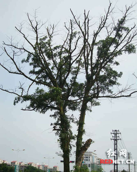 衡陽“最牛釘子樹”不再“牛” 大部分枝丫枯死 衡陽市解放大道和華新大道交匯的十字路口,一棵古樹可能不少市民都見過。這棵樹所處的位置雖幾經修路,但樹卻依然聳立在路中央,迎接南來北往的車流和人流,因此被網友稱為“衡陽最牛釘子樹”。 3月4日,經筆者在論壇發帖后,此樹引起了廣泛的社會關注。大家普遍認為,這棵“最牛釘子樹”彰顯了衡陽管理者的愛綠護綠意識,是一件好事。 近日,筆者路過這個路口,看見“最牛釘子樹”已奄奄一息,再也“牛”不起來。本是枝繁葉茂的季節,卻大部分枝丫已經枯死,不見葉片,與網友幾年前初春時拍下的照片形成了鮮明的對比。