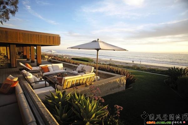 For the narrow lot of this beachfront home near Santa Barbara, landscape architect Keith LeBlanc created a tropical garden with a palette of materials that reflects the cool lines of the owner's modernist home. Bronzy phorumium kept low in a sunken bed surrounding the oceanfront terrace afford unbroken sunset views. 由于圣巴巴拉附近海濱的度假屋場地狹小,景觀設計師凱斯•勒布蘭采用了能以冷線條反映主人現代派家園的主色調,創建了一個熱帶花園。低矮的青銅色新西蘭麻種植在觀海露臺周圍的低處花壇內,整體高度不會影響到欣賞完整的日落景觀。