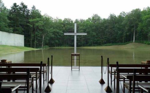 ![]() ![]() 水的教堂位于北海道夕張山脈東北部群山環抱之中的一塊平地上。從每年的12月到來年4月這里都覆蓋著雪,這是一塊美麗的白色的開闊地。安藤忠雄和他的助手們在場里挖出了一個90m×45m的人工水池,從周圍的一條河中引來了水。水池的深度是經過精心設計的,以使水面能微妙地表現出風的存在,甚至一陣小風都能興起漣漪。
