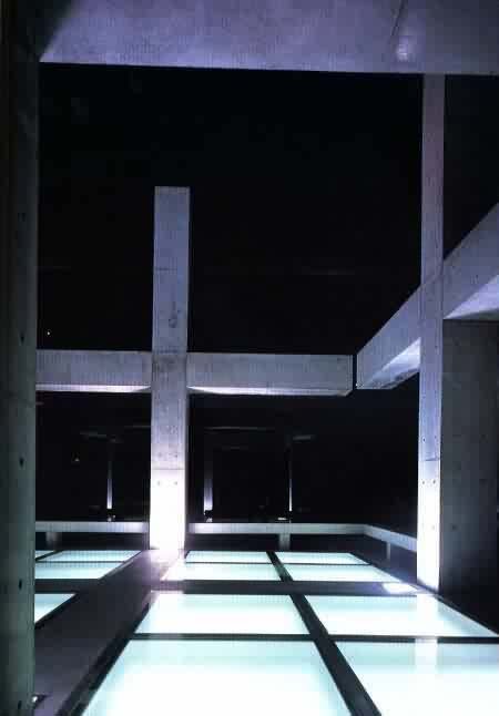 面對池塘,設計將兩個分別為10m方和15m見方的正方形在平面上進行了疊合。環繞它們的是一道“L”型的獨立的混凝土墻。人們在這道長長的墻的外面行走是看不見水池的。只有在墻盡頭的開口處轉過180°,參觀者才第一次看到水面。在這樣的視景中,人們走過一條舒緩的坡道來道四面以玻璃圍合的入口。這是一個光的盒子,天穹下矗立著四個獨立的十字架。玻璃襯托著藍天使人冥思禪意。整個空間中充溢著自然的光線,使人感受到宗教禮儀的肅穆。接著,人們從這里走下一個旋轉的黑暗樓梯來到教堂。水池在眼前展開,中間是一個十字架。一條簡單的線分開了大地和天空、世俗和神明。教堂面向水池的玻璃面是可以整個開啟的,人們可以直接與自然接觸,聽到樹葉的沙沙聲、水波的聲響和鳥兒的鳴唱。天籟之聲使整個場所顯得更加寂靜。在與大自然的融合中,人們面對著自我。背景中的景致隨著時間的轉逝而無常變幻。