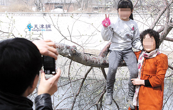 桃花園里嬌艷怒放的桃花引得眾多市民前往賞花留影,不過一些市民為了能夠拍一張好照片不惜登高爬樹,甚至是折斷花枝配合鏡頭。