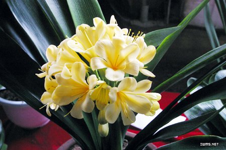 學 名: Clivia nobilis 科 屬: 石蒜科君子蘭屬 根肉質纖維狀,葉基部形成假鱗莖,葉形似劍,長可達45厘米,互生排列,全緣。傘形花序頂生,每個花序有小花7~30朵,多的可達40朵以上。小花有柄,在花頂端呈傘形排列,花漏斗狀,直立,黃或橘黃色。可全年開花,以春夏季為主。果實成熟期10月左右。 原產非洲南部。 喜溫暖涼爽環境,冬季需充足陽光,夏季略加遮陰。要求疏松肥沃的腐葉土。冬季室溫低于5℃或夏季高于30℃,對生長和開花不利。 用播種和分株繁殖。 華北以南地區夏季休眠。生長適溫15~25℃, 要求半陰,怕直射陽光,忌根際積水。 觀賞應用 : 高雅肅穆,葉片狹長,花莖稍短葉于葉,花橙黃色,開放時下垂,呈桶狀,是http://www.cnefs.com'>春節期間布置會場,點綴賓館、美化家庭環境的盆栽花卉。 葉面挺拔,直立,花葶高聳,花多鮮艷,花朵呈“垂首昂立”狀,能烘托悲壯、肅穆的氣氛,多用于這種場合擺放用花。
