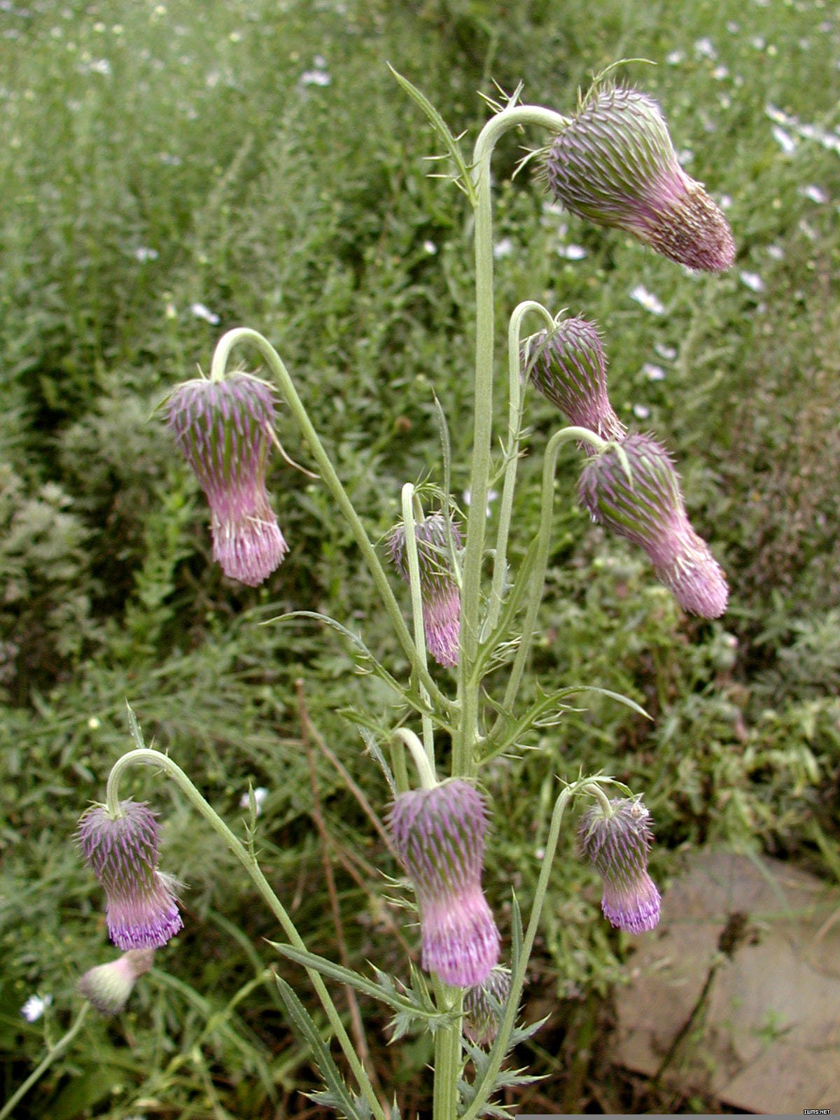 學名:Cirsium japonicum 別名:山蘿卜 科屬:菊科 形態特征: 常見的有大薊和小薊: ①大薊: 多年生直立草本,具多數肉質圓錐根。全株有硬刺,密被白色軟毛,葉互生,羽狀分裂,裂片具不長的淺裂和針刺、頭狀花序頂生,初夏開紫紅花。野生于路旁。 ②小薊: 多年生草本。葉互生,卵形或橢圓形,邊緣有刺,兩面有白色絲狀毛。頭狀花序頂生,夏季開紫紅花。生于路邊和田野。分布我國長江流域各省。也可藥用,功能止血、涼血。 花語:獨立 分析: 喜歡此花的你對自己要求嚴格,處事有自已的原則和計劃,不會受旁人影響,是個完全獨立的人。 這本來是好事,但做人太過決斷會失去人緣,容易被人誤會,如果你希望在各方面都有表現,就要改善一下待人的態度。 花箴言:冷峻的人臉上難得有笑容。