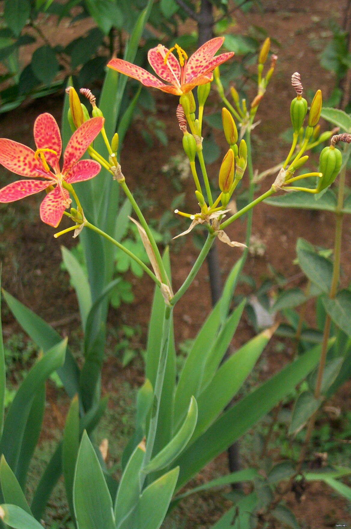學(xué)名:Belamcanda chinensis 別名:扁竹,螞螂花 科屬:鳶尾科 種類(lèi): 多年生草本 產(chǎn)地:分布于湖北、河南、安徽等20多個(gè)省、區(qū). 生長(zhǎng)習(xí)性: 喜陽(yáng)光、溫暖、耐干旱、耐寒,野生于山坡、曠地、河谷和荊棘叢中。 射干雖喜干旱、耐嚴(yán)寒,但在出苗期和定苗朗需澆水。保持田間濕潤(rùn),幼苗高達(dá)10厘米時(shí)可不澆水。雨季應(yīng)注意排水,防止田間積水而造成爛根。 植物特征 : 高50~120cm。根狀莖橫生,略呈結(jié)節(jié)狀,外皮鮮黃色,生多數(shù)須根。莖直立,下部生葉。葉2列,嵌迭狀排列,寬劍形,扁平,長(zhǎng)25~60cm,寬2~4cm,綠色,常帶白粉,基部抱莖,葉脈平行。聚傘花序傘房狀頂生;總花梗和小花梗基部具膜質(zhì)的苞片, 花桔黃色,直徑3~5cm,花被片 6,橢圓形,長(zhǎng)2~2.5cm,寬約 1cm,散生暗紅色斑點(diǎn),內(nèi)輪 3片較外輪 3片略小,基部合生成短筒,雄蕊3,著生在花被片基部;子房下位,3室,花柱棒狀,頂端 3淺裂,被短柔毛。 蒴果倒卵圓球形,長(zhǎng)2.5~3.5cm,有 3縱棱,成熟時(shí)沿縫線 3瓣裂。種子黑色,近球形,有光澤。 花期7~9月,果期8~9月。 性味與歸經(jīng):苦,寒。歸肺經(jīng)。 功能與主治: 清熱解毒,消痰,利咽。 于熱毒痰火郁結(jié),咽喉腫痛,痰涎壅盛,咳嗽氣喘。 貯藏: 置干燥處。 采收加工: 射干在生長(zhǎng)2年后(種子繁殖需2年,根莖繁殖只需1年)的寒露時(shí)刨收。將刨出的根莖去掉莖桿和項(xiàng)根,洗凈曬干即可出售。 射干不但入藥,而且還是名貴花卉,是外貿(mào)出口產(chǎn)品。 近年由于采挖過(guò)度,致使資源日漸緊缺。因此,發(fā)展射干生產(chǎn)是農(nóng)家脫貧的一條好門(mén)路。一般畝產(chǎn)干藥可達(dá)200至250千克。