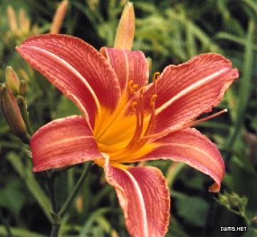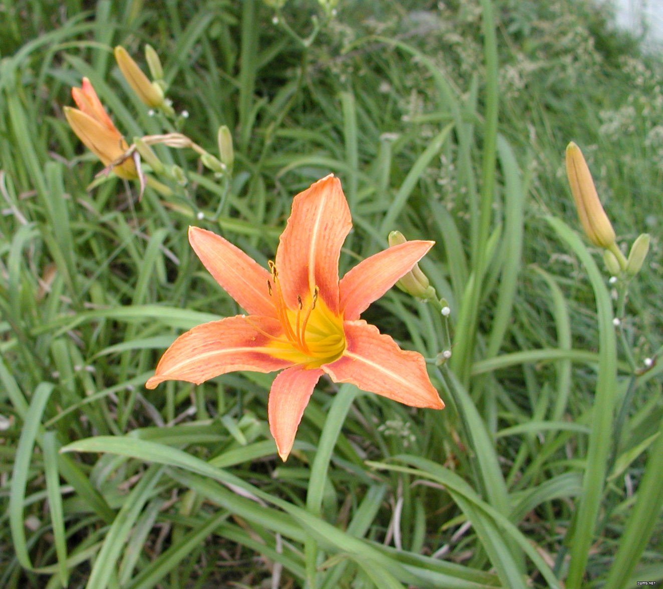 學名:Hemerocallis fulva 別名:川草花,忘憂草 科屬:百合科 生態特征: 多年生宿根草本,有地下球莖。 全株光滑無毛。葉自根莖叢生,狹長成線形,葉脈平行;ㄇo由葉叢抽出,高1米上分枝,呈圓錐花序,數朵出于頂端,花大黃色,花冠呈漏半狀,紛披六出,5一7月開放,單朵花只開一天。 朔果具少數種子。 產地: 原產我國,南北廣為栽培, 生長習性: 喜溫暖潮濕,對環境要求不嚴格,耐半蔭。 繁殖: 用分株法繁殖。于10月-11月將3年-4年株掘起,分起3株-6株,每株須帶有完整的芽頭,然后按行距1米,株距0.5米,坑深0.3米,先將基肥施人坑中,略蓋細土,然后栽上,栽后覆土4厘米-5厘米,壓實,然后再澆透水。 分栽也可3月份進行。 管理: 培育期間,春夏松土除草1次-2次;3月-6月內,每月施3倍-5倍水的腐熟人糞尿液,如花前施1次磷肥,可提高花的質量,萱草喜濕潤,要適時澆水。 冬季葉子枯萎,可將地上部割去,覆土一層,以便越冬,栽培土要求濕潤,肥沃,排水良好的砂壤土。 品種: 萱草的品種極多,還有小花型和重瓣型,雜交品種花色有淡黃、橙紅、淡雪青、玫紅等色。 珍貴的品種一莖可開四、五十朵花,真是千姿百態,絢麗多彩。 用途: 萱草不僅是名花佳卉,而且還是美味良蔬,其花曬干供食用,俗稱“黃花菜”。 萱草有鎮靜安眠作用,且少有副作用,對各種原因引起的失眠癥,尤其是肝功能障礙伴有失眠者,是一種比較理想的藥物。萱草花有藥食同功的雙重功能,不但營養價值極高,且有極好的健腦效果,在日本稱為健腦菜,並列為「植物性食品中最有代表性的健腦食品之一」。 另外,據吳李久華在《延壽考》中云:「嫩苗為蔬,食之動風,令人昏然如醉,因名忘憂」!度悍甲V》記載:“春食苗,夏食花,其雅牙花的跗皆可食。但性冷下氣,不可多食!吨兴幋筠o典》載其含有生物鹼、黃酮類。據測定每100克乾製品中含蛋白質9.14克、脂肪0.4-0.25克、糖分50-60.2克、鈣300-463毫克,並含有維生素A、B、C及多種微量元素。