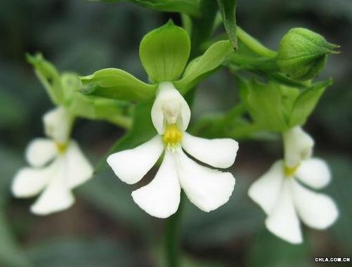 學名:Calanthe argenteo-striata 科屬: 蘭科 植物種類: 多年生常綠草本,地生蘭. 該屬植物約250種,中國有50種,分布于亞洲熱帶亞熱帶。 形態(tài)特征: 植株無明顯的根狀莖。假鱗莖粗短,近圓錐形,粗約1.5厘米,具2—3枚鞘和3— 7枚在花期展開的葉。葉上面深綠色,帶5--6條銀灰色的條帶,橢圓形或卵狀披針形, 長18--27厘米,寬5—11厘米,先端急尖,基部收狹為長約3--4厘米的柄,無毛或背 面稍被短毛。花葶從葉叢中央抽出,長達60厘米,密被短毛,具3--4枚筒狀鞘;總狀 花序長7—11厘米,具10余朵花;花苞片寬卵形,長約1.5厘米,先端急尖,背面被毛. 花梗和子房黃綠色,長約3厘米;花張開;萼片和花瓣多少反折,黃綠色;中萼片 橢圓形,長9毫米,寬4.5毫米,先端鈍并具短芒,具5條脈,背面被短毛;側萼片寬 卵狀橢圓形,長10毫米,寬5.5毫米,先端鈍并具短芒,具5條脈,背面被短毛. 花 瓣近匙形或倒卵形,比萼片稍小,先端近截形并具短凸,具3條脈,無毛;唇瓣白色, 與整個蕊柱翅合生,比萼片長,基部具3列金黃色的小瘤狀物,3裂;側裂片近斧頭 狀,長和寬均7毫米,先端近圓形;中裂片深2裂;小裂片與側裂片等大;距黃綠色, 細圓筒形,長1.5—1.9厘米,向末端變狹,外面疏被短毛;蕊柱白色,長約5毫米; 蕊喙2裂,軛形;藥帽白色、前端收狹,先端喙狀;花粉團狹倒卵球形或狹棒狀,近等 大,長約2毫米,具短的花粉團柄,粘盤近方形。 花期4--5月。 產(chǎn)地分布: 產(chǎn)廣東北部(從化)、廣西西南部(龍州)、貴州西南部(興義、安龍)和云南東南 部(金平、麻栗坡)。 生于海拔500—1200米的山坡林下的巖石空隙或覆土的石灰?guī)r面上。