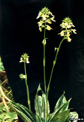 學名:Calanthe argenteo-striata 科屬: 蘭科 該屬植物約250種,中國有50種,分布于亞洲熱帶亞熱帶。 形態(tài)特征: 植株無明顯的根狀莖。假鱗莖粗短,近圓錐形,粗約1.5厘米,具2—3枚鞘和3— 7枚在花期展開的葉。葉上面深綠色,帶5--6條銀灰色的條帶,橢圓形或卵狀披針形, 長18--27厘米,寬5—11厘米,先端急尖,基部收狹為長約3--4厘米的柄,無毛或背 面稍被短毛。花葶從葉叢中央抽出,長達60厘米,密被短毛,具3--4枚筒狀鞘;總狀 花序長7—11厘米,具10余朵花;花苞片寬卵形,長約1.5厘米,先端急尖,背面被毛. 花梗和子房黃綠色,長約3厘米;花張開;萼片和花瓣多少反折,黃綠色;中萼片 橢圓形,長9毫米,寬4.5毫米,先端鈍并具短芒,具5條脈,背面被短毛;側萼片寬 卵狀橢圓形,長10毫米,寬5.5毫米,先端鈍并具短芒,具5條脈,背面被短毛. 花 瓣近匙形或倒卵形,比萼片稍小,先端近截形并具短凸,具3條脈,無毛;唇瓣白色, 與整個蕊柱翅合生,比萼片長,基部具3列金黃色的小瘤狀物,3裂;側裂片近斧頭 狀,長和寬均7毫米,先端近圓形;中裂片深2裂;小裂片與側裂片等大;距黃綠色, 細圓筒形,長1.5—1.9厘米,向末端變狹,外面疏被短毛;蕊柱白色,長約5毫米; 蕊喙2裂,軛形;藥帽白色、前端收狹,先端喙狀;花粉團狹倒卵球形或狹棒狀,近等 大,長約2毫米,具短的花粉團柄,粘盤近方形。 花期4--5月。 產(chǎn)地分布: 產(chǎn)廣東北部(從化)、廣西西南部(龍州)、貴州西南部(興義、安龍)和云南東南 部(金平、麻栗坡)。 生于海拔500—1200米的山坡林下的巖石空隙或覆土的石灰?guī)r面上。