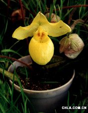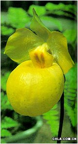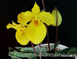 科名: 蘭科 科拉丁名: Ochidaceae 屬名: 兜蘭屬 杏黃兜蘭花未開時呈青綠色,開前為綠黃色,全開時為杏黃色,后期金黃色,在陽光下閃耀出一片金輝,顯得富麗而華貴。花從開放到凋謝約40天至50天,是世界上觀賞花卉植物中花期較長的珍奇花卉。 性狀 : 附生蘭。具細長而橫走的根狀莖。 根狀芭直徑2—3mm。葉5—7,長圓形。花葶直立或近直立,有綠色和紫色斑點及褐色硬行,花單生,杏黃色,花瓣大,闊卵形或近圓形,唇瓣囊狀。 它的葉片也很奇特,葉藝變化豐富,葉姿優美,長7—9厘米,寬3—4厘米,葉背紫色,葉表灰綠色,有深綠的斑紋,它是野生矮種兜蘭中極罕見的富于觀賞價值的珍品。 分布: 產云南西北部福貢、碧江、瀘水等縣。緬甸可能也有分布。 海拔上限: 2100 生境 : 喜生于巖石縫隙中,耐旱。單株生長,植株不抽苔,葉片披針形,長10cm左右,寬3cm左右,鐵青色,葉表有白色斑點,厚而硬,不易彎曲。春天開花,一桿一花,花桿從植株中心抽出一株終生只開一次花。花桿高25cm左右,花的兜口寬1.5cm左右,花兜可容納一羹匙水,實在稀奇。這種兜蘭繁殖,其出芽方式獨特,即當年長的根于次年才根端生出芽來,竄出土面自成一株。根喜生在沙石、腐葉土、朽木混合的盆土中,見土即活。