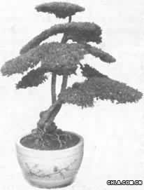作者在10年前便根據(jù)樹坯的條件作了全面構(gòu)想,努力追求看似抽象實(shí)則深遠(yuǎn)的詩情畫意,大刀闊斧地刪去繁枝冗節(jié),突出三根主干,經(jīng)過反復(fù)的補(bǔ)蟠修剪,逐步達(dá)到干身粗壯。枝蒼翠的效果,與國畫中的柏造型相近似,待到繁花怒放,于是就出了“六月飛雪”的奇觀。