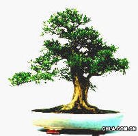 扶搖直上:在荒山曠野,常見有一種依山傍石,臨風挺立的大樹,它雖不比紅棉挺拔蒼勁,但也不乏剛陽 之氣,這就是單干企樹。單干樹的造型特點是不用“對門枝”,枝托的位置沒有明顯規則,大小比例要基本恰當,但又不必完全按列排序,并且要刻意搭配一兩條跌枝或垂枝,使造型顯得更生動活潑。枝型多用雞爪枝、平行枝、垂枝。