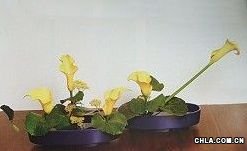 欣賞:彩色海芋與夕霧草暖暖的金黃,是整個夏天醉臥過的痕跡,銀荷葉與海芋梗讓綠的表現更有變化,在不經意中展現無限生趣。