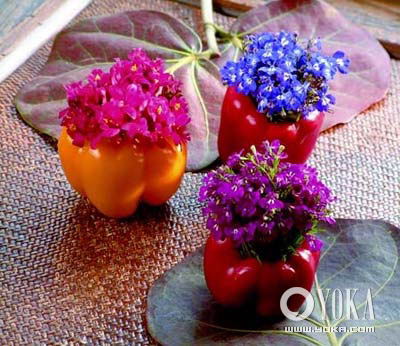 餐廳、游戲區(qū)等聚會氣氛熱烈的場所,就需要裝飾性強,能烘托氣氛的花藝設(shè)計了。不過,這里說的造型感強,并不需要高難的專業(yè)技巧,只要了解一些植材的特點,直接發(fā)揮就好。可能是幾片花葉、一兩個水果甚至一棵青菜! 造型感強,比如塊狀花材、傳統(tǒng)的球形很飽滿,都很有裝飾效果。除了色彩飽滿的花材,對比色調(diào)的設(shè)計營造氣氛也很熱烈,形式優(yōu)美的綠葉配上大朵的牡丹,球形的西蘭花點綴紅色晶瑩的六倍利或櫻桃,布置餐桌或點綴茶點都很有效果。 還可以找些特異的花器,突出效果。用酒杯、用貝殼、用蛋糕烤盤、甚至就用花材、蔬菜自己!靈機隨現(xiàn),都能使得賓主皆歡顏。 花材:六倍利 花器:彩椒(以蔬果為容器) 以彩椒為容器表現(xiàn)熱烈喜慶的氣氛。