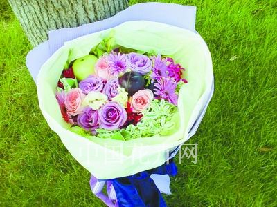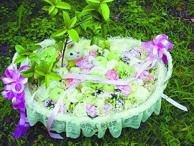 這是一組生日花禮,花藝師將各色玫瑰、非洲菊或百合等主花材與銀邊翠、黃鶯輔材搭配,再點綴上青蘋果、玩偶等配飾,給人清爽的感覺。