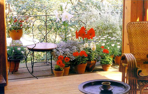 陽(yáng)臺(tái)的空間一般都很有限,常栽種攀緣或蔓生植物,采用平行垂直綠化或平行水平綠化。一般西陽(yáng)臺(tái)夏季西曬厲害,采用平行垂直綠化較適宜。植物形成綠色簾幕,遮擋著烈日直射,起到隔熱降溫的作用,使陽(yáng)臺(tái)形成清涼舒適的小環(huán)境。在朝向較好的陽(yáng)臺(tái),可采用平行水平綠化。為了不影響生活功能要求,要根據(jù)具體條件選擇適合的構(gòu)圖形式和植物材料。