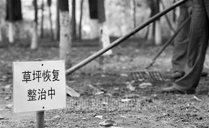 昨日下午,記者在浣花溪公園看到,原先的綠草坪裸露出成片黃色的泥土,有些地方堆著人高的泥巴,一些被損草皮已被掀至一邊堆得老高,“草坪恢復整治中”的提示語言隨處可見,好幾名工人忙著翻土、打藥和鋤草。綠化工人夏家樹揚起鐵鍬深挖植樹的窩,他說這里的子死了不少,只有砍掉死掉的枯竹,重新補種女貞才能讓綠色多起來。