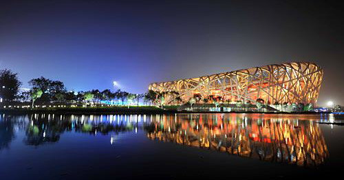 這是7月16日晚拍攝的國家體育場夜景。當晚,北京奧運會主會場“鳥巢”夜景照明系統舉行竣工后的正式彩排。據介紹,鳥巢夜景照明由五個部分組成,其中主體照明以傳統文化元素“中國紅”為主色。鳥巢夜景照明系統可演示不同的動態效果場景,包括金色、銀色、紅色及紅色動態表演。