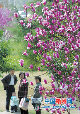 2月24日,幾名市民在贛州宋城公園駐足觀賞盛開的紫玉蘭花。贛州市積極推進中心城區綠化上水平,發揮本土氣候適宜多樣化樹種優勢,實行“一街一景、一景一樹”等綠化舉措,構建五彩繽紛的城市園林景觀
