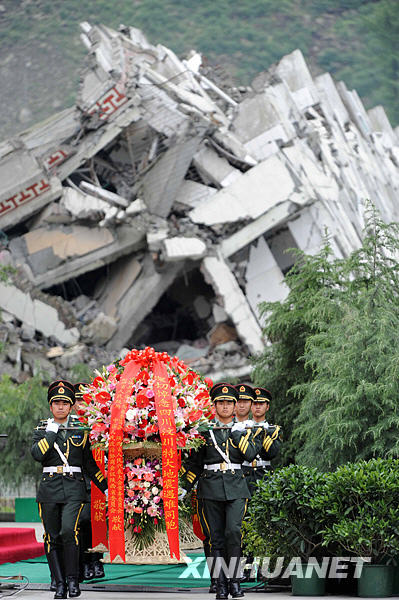 5月12日,紀念四川汶川特大地震一周年活動在四川省汶川縣映秀鎮舉行。伴隨著深情的《獻花曲》,20名禮兵抬起10個花籃,正步走向四川汶川特大地震紀念表盤,將花籃擺放在紀念表盤前。新華社記者丁林攝