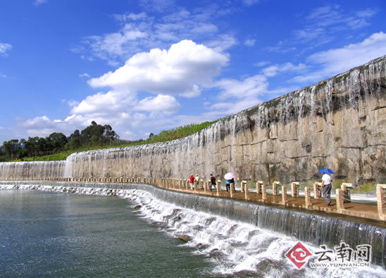 撫仙湖、星云湖水潛流23公里后進入玉溪中心城區,形成一道寬276米的人工大瀑布。[記者 蔣貴友 攝]