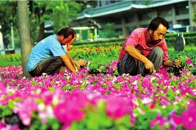 昨(1日)天,在交通部對面的綠化帶里,20多位園林綠化工人正在修剪枝椏,空地上擺滿了小花盤,紅黃綠紫,顏色多樣,引來眾多市民觀看。市園林綠化局透露,根據國慶60周年北京花卉景觀布置規劃,全市將布置各類花卉共達4000萬盆。其中,天安門廣場將在十一期間設置一組中心花壇,長安街沿線步道將布置22處立體花壇,面積達十萬余平米。其中,天安門廣場中心花壇作為主花壇,現暫定將安排在天安門中心廣場偏南10米的位置,呈圓形,突出“普天同慶”的主題;▔睆綄⑦_40米,中心主花籃高達13米,將選用真假花卉結合的方式,主選花種有粉矮牽;ā⑿↑S菊等。市園林綠化局負責人表示,主花壇的設計和布置還未最終確定,將在國慶游行排練之后,按實際需要做相應的修改和調整。
