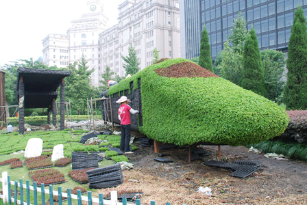 杭州城一角,園藝工人正在“奔馳的時代列車”上忙碌著,這輛列車目前已初具雛形,據悉將于9月25日“通車”。眾多布局新穎、花卉艷麗、美不勝收的綠化立體小品和街景時花擺放,將為杭州的國慶節日氛圍增添濃重的一筆。