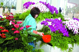 昨日,花博會(huì)北京展廳,工作人員正在為鮮花澆水。
