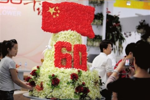 上海展館扎花迎國慶。