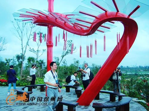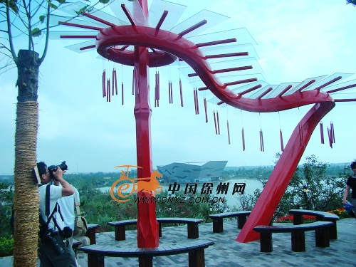 “落雨聽琴景觀是整個徐州展園的重點。該景觀在山頂設立一個現代形式的休閑亭,取名觀雨亭。”李云峴介紹,亭中間放置琴臺,亭子檐口設計集水槽,水由屋檐落入鋪裝在亭子周圍的凹槽中,從而形成雨簾;亭子前設置景石堆砌的花池,池中栽植各種花卉;亭周圍以高大喬為背景,在藍天綠樹的襯托下,令觀雨亭更富藝術魅力。“值得一提的是,在亭的檐口,我們掛上了各種銅質的風鈴。即使在無雨的日子里,一樣可以聽到風鈴發出的‘雨聲’。”